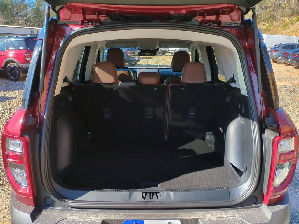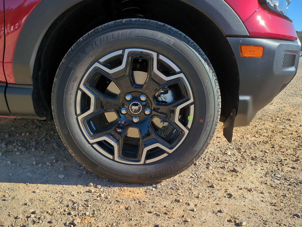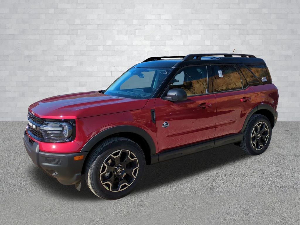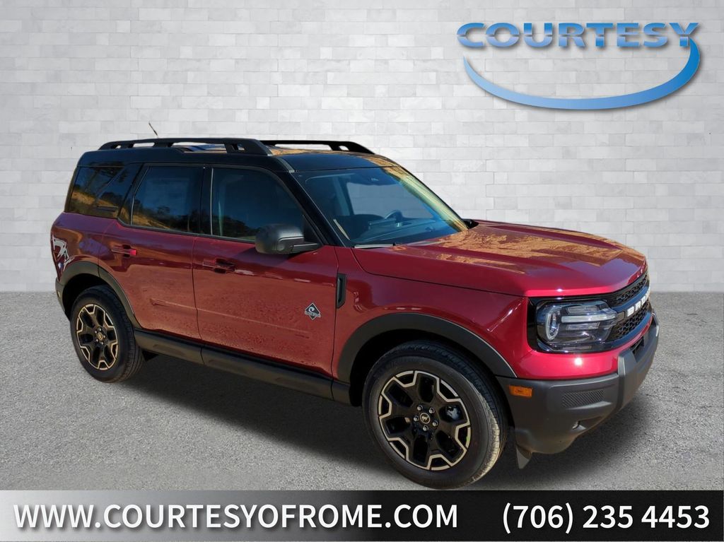 2025 Ruby Red Metallic Tinted Clearcoat 2025 Ford Bronco Sport Outer Banks 4WD 1.5L EcoBoost Equipment Group 300A, 4-Wheel Disc Brakes, 6 Speakers, ABS brakes, Air Conditioning, Alloy wheels, AM/FM radio: SiriusXM, AM/FM Stereo, Auto High-beam Headlights, Auto-dimming Rear-View mirror, Automatic temperature control, Brake assist, Compass, Delay-off headlights, Driver door bin, Driver vanity mirror, Dual front impact airbags, Dual front side impact airbags, Electronic Stability Control, Emergency communication system: SYNC 4 911 Assist, Four wheel independent suspension, Front anti-roll bar, Front Bucket Seats, Front Center Armrest, Front Driver/Passenger Seat Back Map Pockets, Front dual zone A/C, Front fog lights, Front License Plate Bracket, Front reading lights, Fully automatic headlights, Garage door transmitter, Heated door mirrors, Heated front seats, Heated steering wheel, Illuminated entry, Knee airbag, Low tire pressure warning, Memory seat, Occupant sensing airbag, Outside temperature display, Overhead airbag, Overhead console, Panic alarm, Passenger door bin, Passenger vanity mirror, Power door mirrors, Power driver seat, Power passenger seat, Power steering, Power windows, Premium Trimmed Front Bucket Seats w/Ebony/Roast, Radio data system, Rain sensing wipers, Rear anti-roll bar, Rear Parking Sensors, Rear reading lights, Rear seat center armrest, Rear window defroster, Rear window wiper, Remote keyless entry, Security system, SiriusXM, Speed control, Speed-sensing steering, Speed-Sensitive Wipers, Split folding rear seat, Steering wheel mounted audio controls, SYNC 4 w/Enhanced Voice Recognition, Tachometer, Telescoping steering wheel, Tilt steering wheel, Traction control, Trip computer, Variably intermittent wipers, and Wheels: 18" Ebony Black-Painted Aluminum Courtesy Ford and Lincoln of Rome 101 Hwy 411 E Rome, Ga 30161 ROMEFORDLINC.COM 706.235.4453.