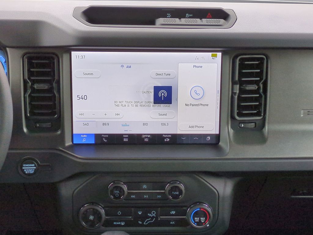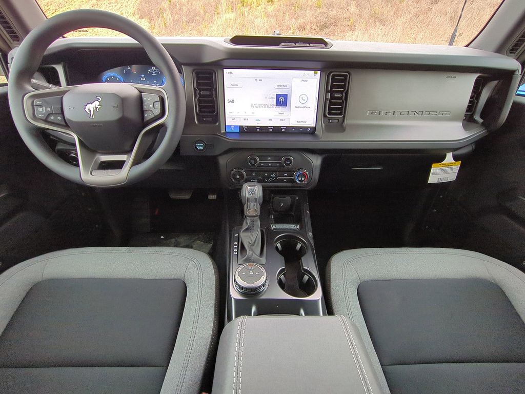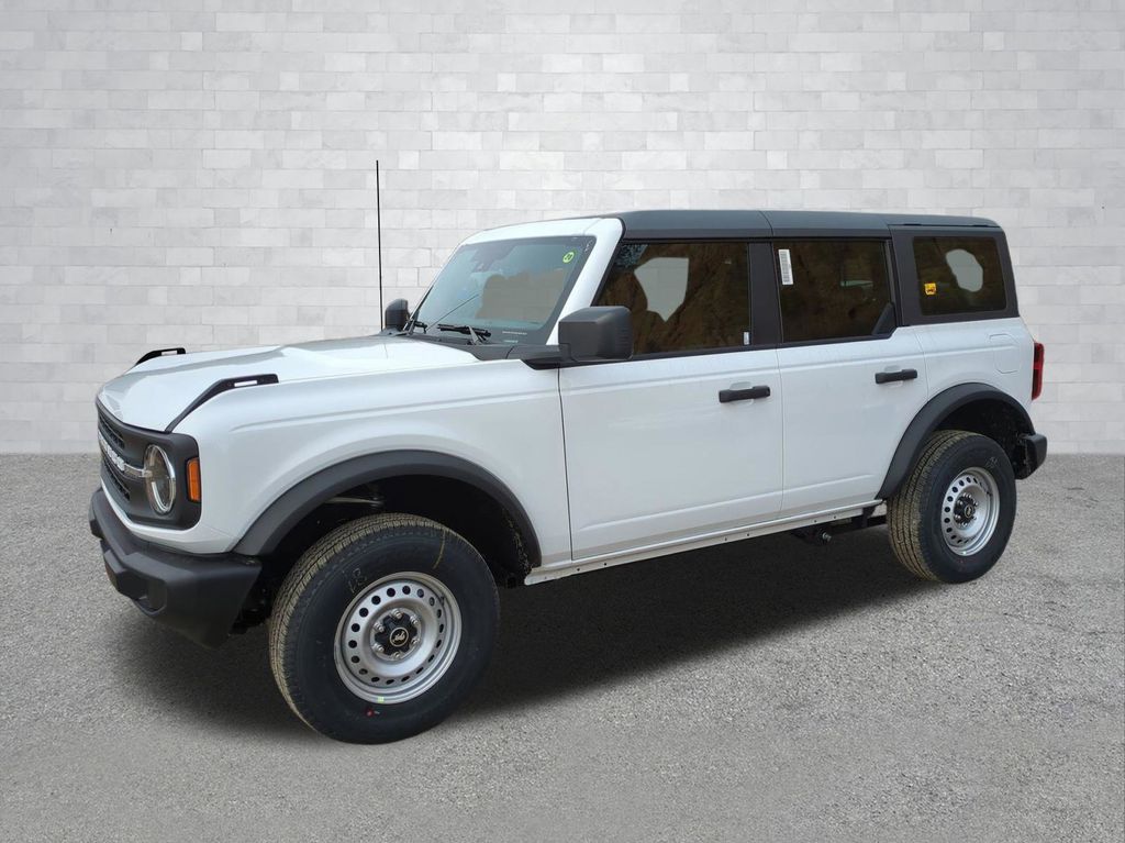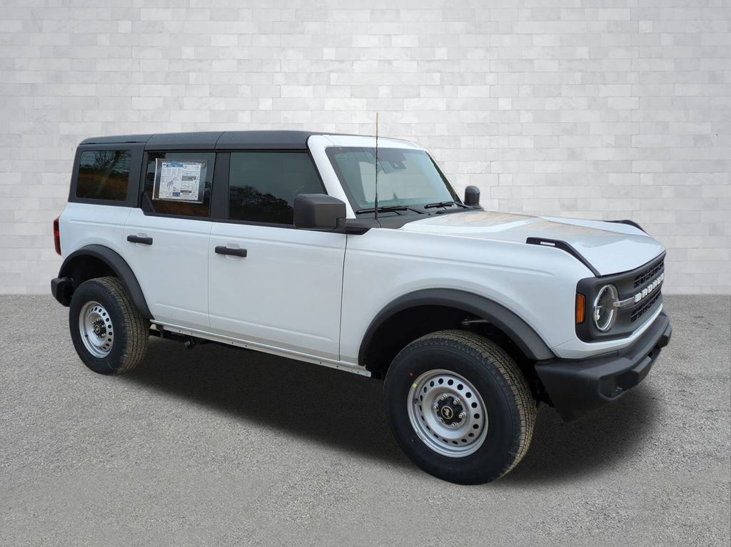 2025 Oxford White 2025 Ford Bronco Base 4WD 2.3L EcoBoost I-4 4-Wheel Disc Brakes, 4.46 Axle Ratio, 7 Speakers, ABS brakes, Air Conditioning, AM/FM radio: SiriusXM with 360L, AM/FM Stereo, Auto High-beam Headlights, Brake assist, Cloth Bucket Seats, Compass, Delay-off headlights, Driver door bin, Driver vanity mirror, Dual front impact airbags, Dual front side impact airbags, Electronic Stability Control, Emergency communication system: 911 Assist, Exterior Parking Camera Rear, Front anti-roll bar, Front Bucket Seats, Front Center Armrest, Front reading lights, Front wheel independent suspension, Fully automatic headlights, Heated door mirrors, Illuminated entry, Integrated roll-over protection, Internet access capable: FordPass Connect, Low tire pressure warning, Occupant sensing airbag, Outside temperature display, Overhead airbag, Overhead console, Panic alarm, Passenger door bin, Passenger vanity mirror, Power door mirrors, Power steering, Power windows, Radio data system, Remote keyless entry, Security system, SiriusXM w/360L, Speed control, Split folding rear seat, Steering wheel mounted audio controls, SYNC 4, Tachometer, Telescoping steering wheel, Tilt steering wheel, Traction control, Trip computer, Variably intermittent wipers, and Wheels: 16" Bright Polished Silver-Painted Steel Courtesy Ford and Lincoln of Rome 101 Hwy 411 E Rome, Ga 30161 ROMEFORDLINC.COM 706.235.4453.