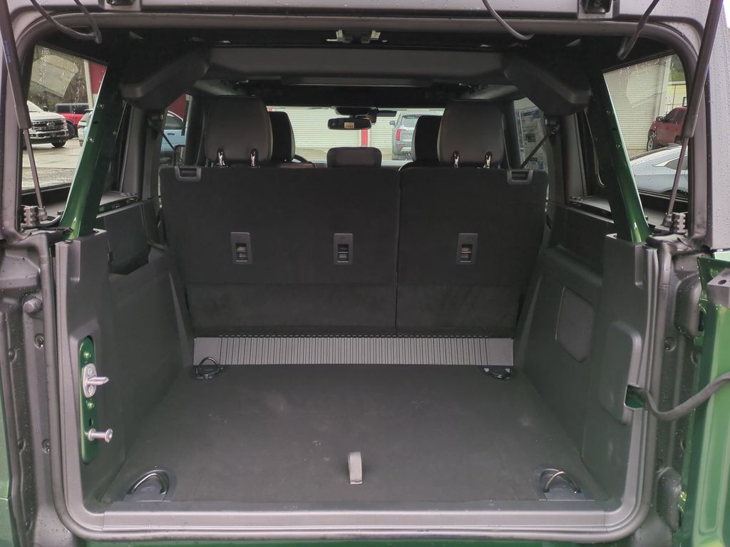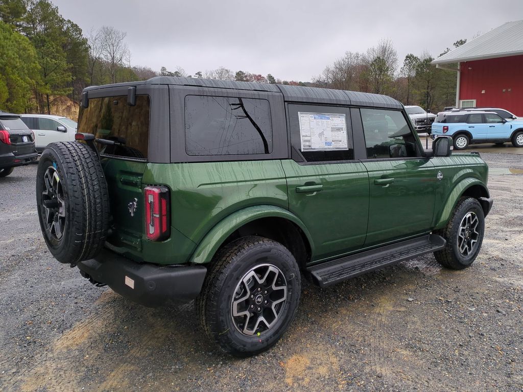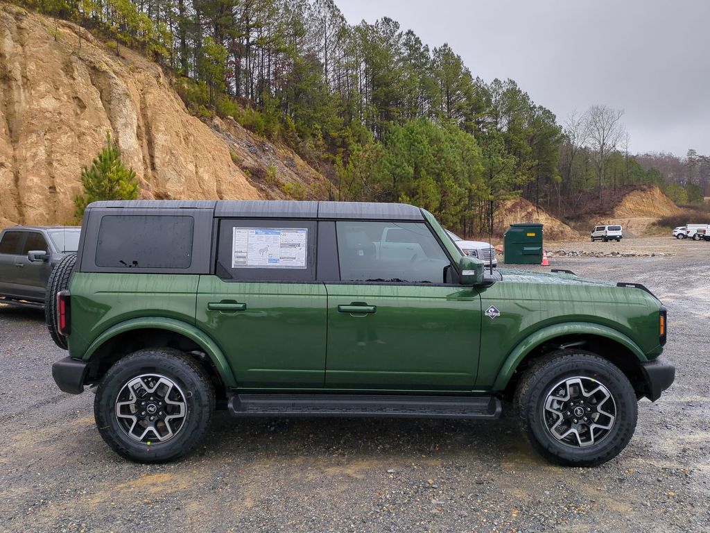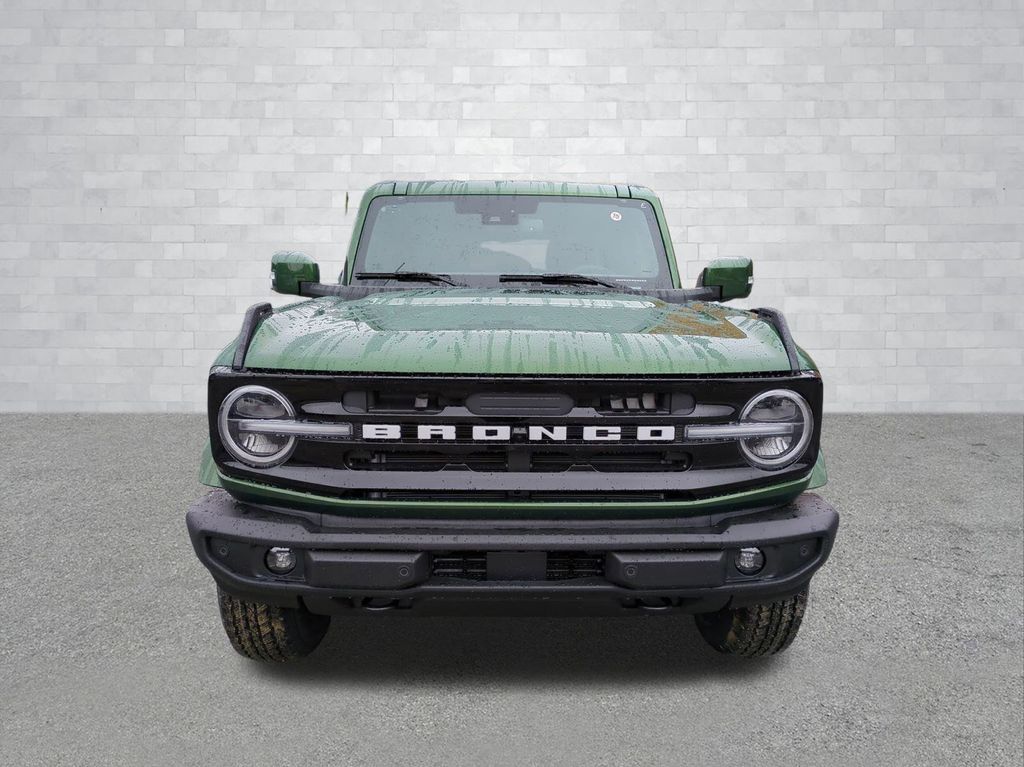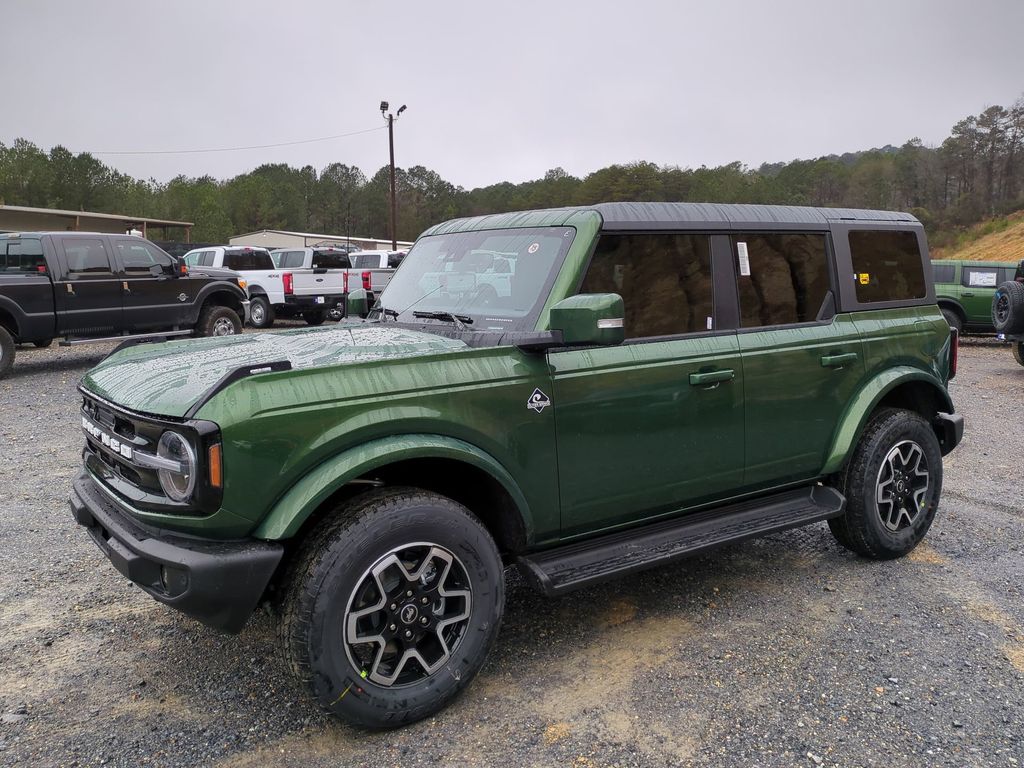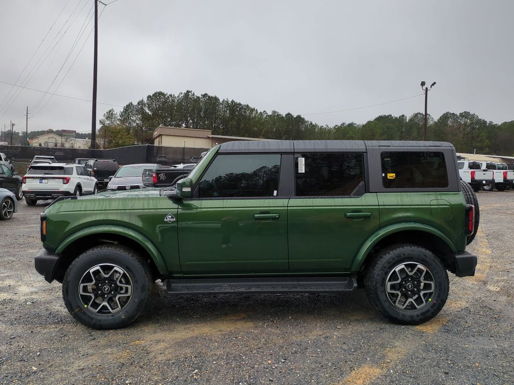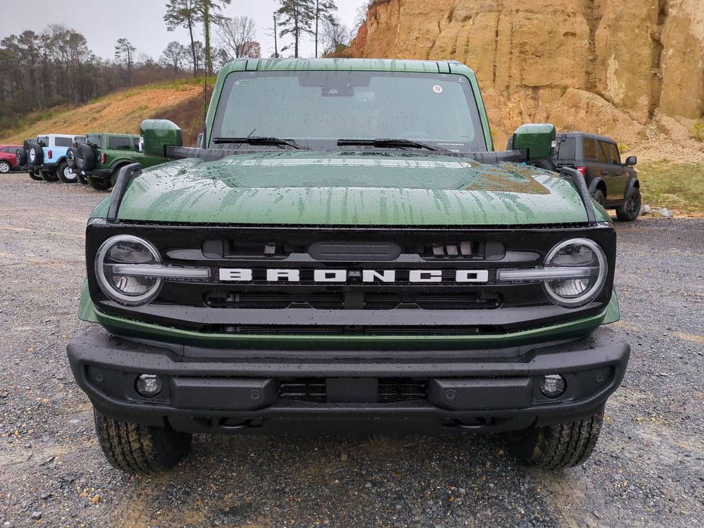 2025 Eruption Green Metallic 2025 Ford Bronco Outer Banks 4WD 2.3L EcoBoost I-4 Equipment Group 314A Lux Package (360-Degree Camera, Adaptive Cruise Control, Evasive Steering Assist, Front Parking Sensors, Information on Demand Panel, Radio: B&O Sound System by Bang & Olufsen, Sideview Mirrors, and Universal Garage Door Opener), 18" Bright Machined Aluminum Wheels, 3.73 Axle Ratio, 4-Wheel Disc Brakes, 7 Speakers, ABS brakes, Air Conditioning, Alloy wheels, AM/FM radio: SiriusXM with 360L, AM/FM Stereo, Auto High-beam Headlights, Auto-dimming Rear-View mirror, Automatic temperature control, Brake assist, Carbonized Gray Molded-In-Color Hard Top, Compass, Connected Navigation, Delay-off headlights, Driver door bin, Driver vanity mirror, Dual front impact airbags, Dual front side impact airbags, Electronic Stability Control, Emergency communication system: 911 Assist, Exterior Parking Camera Rear, Front anti-roll bar, Front Bucket Seats, Front Center Armrest, Front dual zone A/C, Front fog lights, Front reading lights, Front wheel independent suspension, Fully automatic headlights, Hard Top Sound Deadening Headliner, Heated door mirrors, Heated front seats, Heated Leather-Trimmed/Vinyl Bucket Seats, Heated steering wheel, Illuminated entry, Integrated roll-over protection, Internet access capable: FordPass Connect, Leather Shift Knob, Low tire pressure warning, Navigation system: Connected Navigation, Occupant sensing airbag, Outside temperature display, Overhead airbag, Overhead console, Panic alarm, Passenger door bin, Passenger vanity mirror, Power door mirrors, Power driver seat, Power passenger seat, Power steering, Power windows, Radio data system, Rear seat center armrest, Rear-Window Defroster & Washer, Remote keyless entry, Security system, SiriusXM w/360L, Speed control, Split folding rear seat, Steering wheel mounted audio controls, SYNC 4, Tachometer, Telescoping steering wheel, Tilt steering wheel, Traction control, Trip computer, Variably intermittent wipers, and Voltmeter Courtesy Ford and Lincoln of Rome 101 Hwy 411 E Rome, Ga 30161 ROMEFORDLINC.COM 706.235.4453.