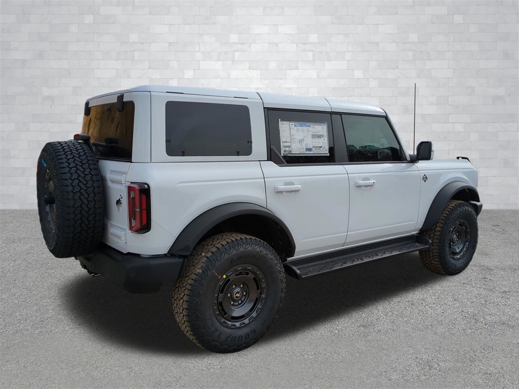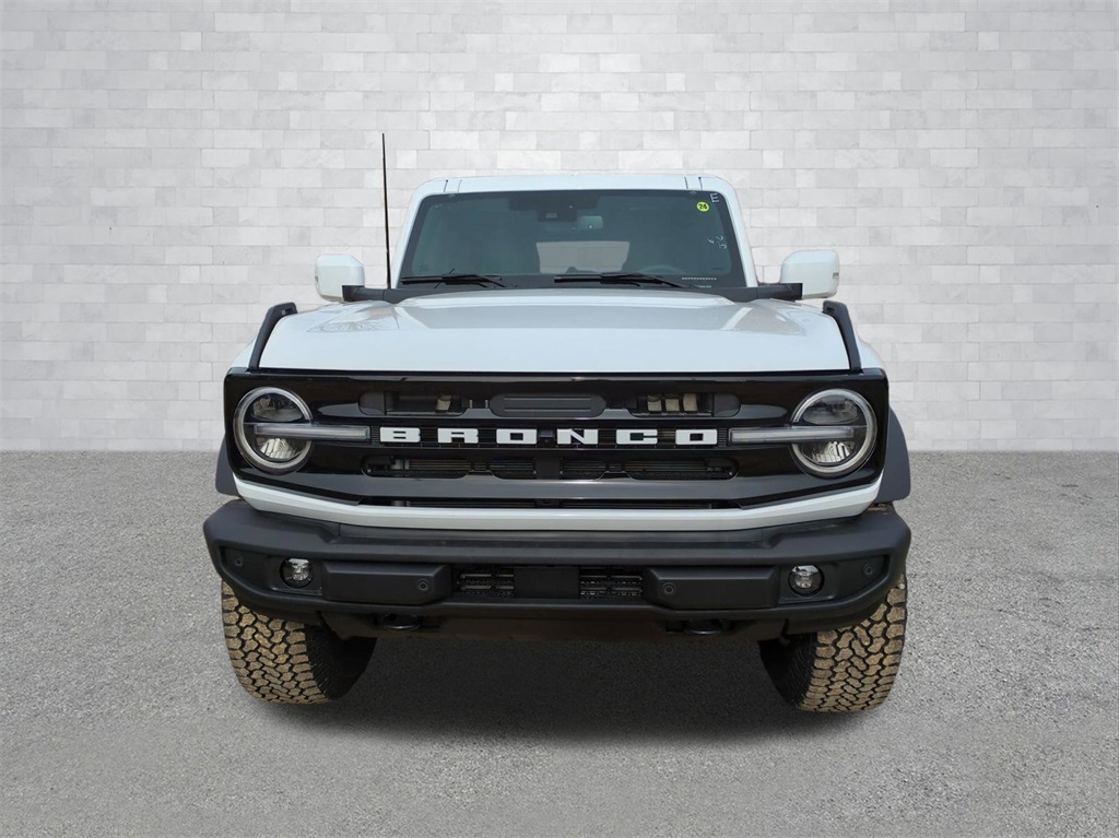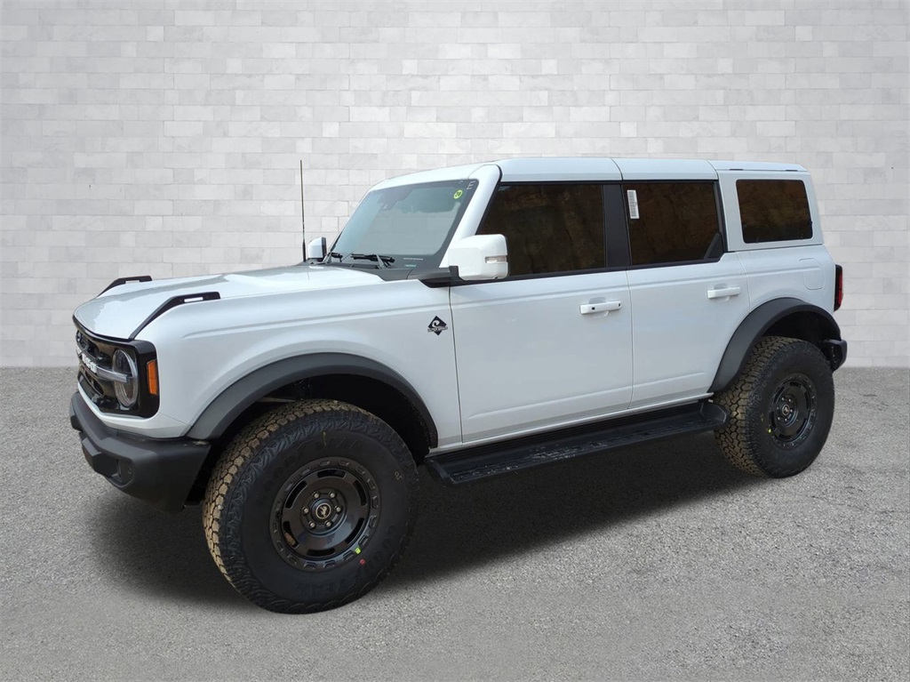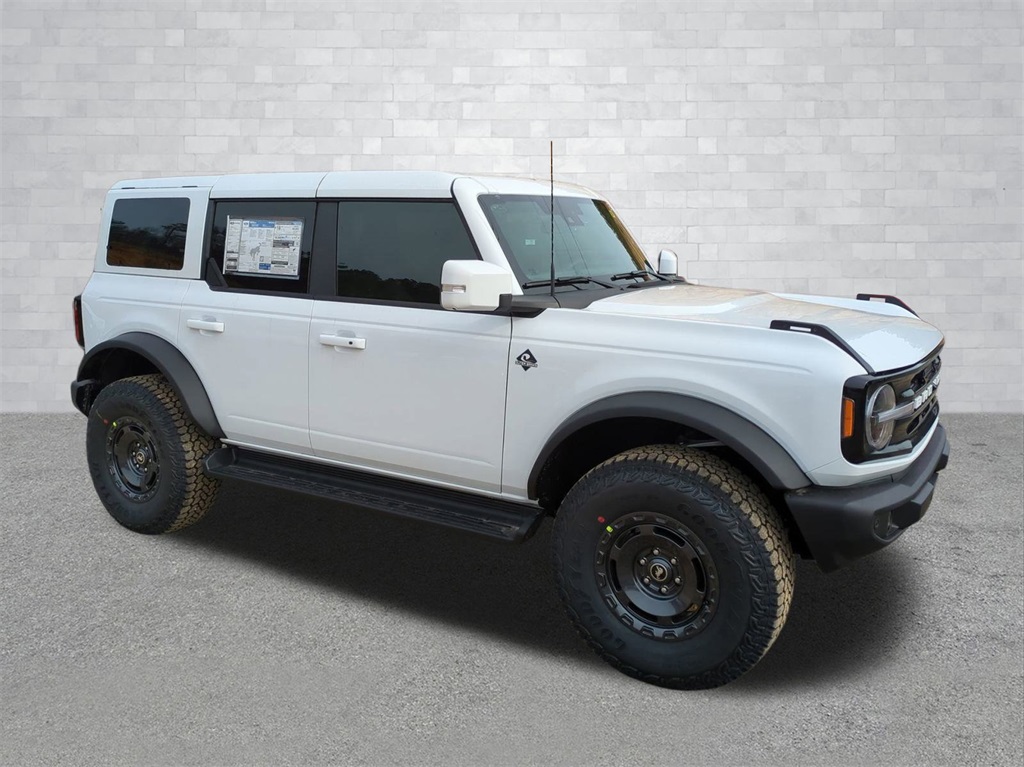 2025 Oxford White 2025 Ford Bronco Outer Banks 4WD 2.7L EcoBoost V6 18" Bright Machined Aluminum Wheels, 3.73 Axle Ratio, 4-Wheel Disc Brakes, 7 Speakers, ABS brakes, Air Conditioning, Alloy wheels, AM/FM radio: SiriusXM with 360L, AM/FM Stereo, Auto High-beam Headlights, Auto-dimming Rear-View mirror, Automatic temperature control, Brake assist, Compass, Connected Navigation, Delay-off headlights, Driver door bin, Driver vanity mirror, Dual front impact airbags, Dual front side impact airbags, Electronic Stability Control, Emergency communication system: 911 Assist, Exterior Parking Camera Rear, Front anti-roll bar, Front Bucket Seats, Front Center Armrest, Front dual zone A/C, Front fog lights, Front reading lights, Front wheel independent suspension, Fully automatic headlights, Heated door mirrors, Heated front seats, Heated Leather-Trimmed/Vinyl Bucket Seats, Heated steering wheel, Illuminated entry, Integrated roll-over protection, Internet access capable: FordPass Connect, Leather Shift Knob, Low tire pressure warning, Navigation system: Connected Navigation, Occupant sensing airbag, Outside temperature display, Overhead airbag, Overhead console, Panic alarm, Passenger door bin, Passenger vanity mirror, Power door mirrors, Power driver seat, Power passenger seat, Power steering, Power windows, Radio data system, Rear seat center armrest, Remote keyless entry, Security system, SiriusXM w/360L, Speed control, Split folding rear seat, Steering wheel mounted audio controls, SYNC 4, Tachometer, Telescoping steering wheel, Tilt steering wheel, Traction control, Trip computer, Variably intermittent wipers, and Voltmeter Courtesy Ford and Lincoln of Rome 101 Hwy 411 E Rome, Ga 30161 ROMEFORDLINC.COM 706.235.4453.