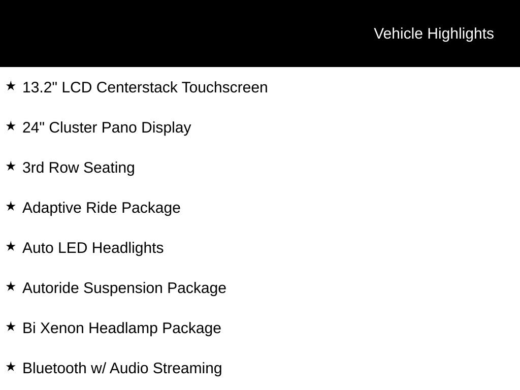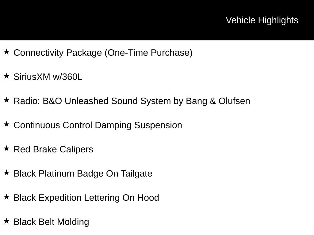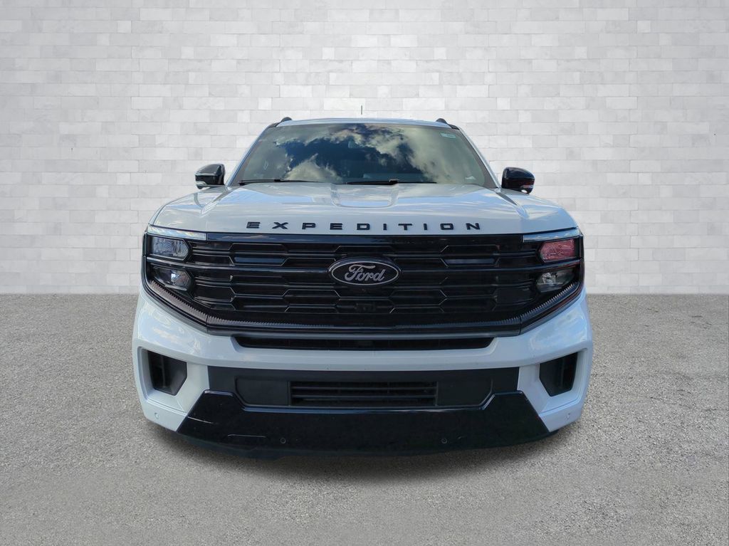 2025 Star White Metallic Tri-Coat 2025 Ford Expedition Platinum Stealth 4WD 3.5L V6 13.2" LCD Centerstack Touchscreen, 24" Cluster Pano Display, 3rd Row Seating, Adaptive Ride Package, Auto LED Headlights, Autoride Suspension Package, Bi Xenon Headlamp Package, Bluetooth w/ Audio Streaming, Hill Descent Control, Hill Start Assist, Intersection Assist, Memory Package, Multi Zone Climate Control, Panoramic Sunroof/Moonroof, Power Mirror Package, Power Package, Push Button Start, Remote Start, Wireless Charging Pad, 4D Sport Utility, 3.5L V6, 10-Speed Automatic, 4WD, 2nd Row Power-Folding Captain's Chairs, Black Belt Molding, Black Expedition Lettering On Hood, Black Headlamp Bezel w/Ebony Trim Applique, Black Platinum Badge On Tailgate, Black Roof Rails, Carbon Black Front Bumper/Fascia, Connectivity Package (One-Time Purchase), Continuous Control Damping Suspension, Driver's Package, Engine Sound Enhancer, Equipment Group 600A Standard Package, High Flow Exhaust System, Navigation System, Radio: B&O Unleashed Sound System by Bang & Olufsen, Rain sensing wipers, Rear Side Windows Laminated Glass, Rear window wiper, Red Brake Calipers, Signature Grille Lighting, SiriusXM w/360L, Speed-Sensitive Wipers, Stealth Appearance Package, Stealth Performance Package, Wheels: 22" Magnetite Painted Aluminum. Connectivity Package (One-Time Purchase), Driver's Package (Continuous Control Damping Suspension, Radio: B&O Unleashed Sound System by Bang & Olufsen, and SiriusXM w/360L), Equipment Group 600A Standard Package (2nd Row Power-Folding Captain's Chairs), Stealth Appearance Package (Black Belt Molding, Black Expedition Lettering On Hood, Black Headlamp Bezel w/Ebony Trim Applique, Black Platinum Badge On Tailgate, Black Roof Rails, Carbon Black Front Bumper/Fascia, Engine Sound Enhancer, Rear Side Windows Laminated Glass, and Signature Grille Lighting), Stealth Performance Package (High Flow Exhaust System, Red Brake Calipers, and Wheels: 22" Magnetite Painted Aluminum), 4D Sport Utility, 3.5L V6, 10-Speed Automatic, 4WD, Navigation System, Rain sensing wipers, Rear window wiper, Speed-Sensitive Wipers, 10 Speakers, 3.73 Axle Ratio, 3rd row seats: split-bench, 4-Wheel Disc Brakes, ABS brakes, Adjustable pedals, Air Conditioning, Alloy wheels, AM/FM radio: SiriusXM with 360L, Apple CarPlay/Android Auto, Auto High-beam Headlights, Auto-dimming door mirrors, Auto-dimming Rear-View mirror, Automatic temperature control, Brake assist, Bumpers: body-color, Compass, Delay-off headlights, Driver door bin, Driver vanity mirror, Dual front impact airbags, Dual front side impact airbags, Electronic Stability Control, Emergency communication system: 911 Assist, Exterior Parking Camera Rear, Four wheel independent suspension, Front anti-roll bar, Front Bucket Seats, Front Center Armrest, Front dual zone A/C, Front reading lights, Fully automatic headlights, Garage door transmitter, Genuine wood dashboard insert, Genuine wood door panel insert, Heated & Ventilated Leather Front Captain's Chairs, Heated door mirrors, Heated front seats, Heated rear seats, Heated steering wheel, Illuminated entry, Leather steering wheel, Low tire pressure warning, Memory seat, Occupant sensing airbag, Outside temperature display, Overhead airbag, Overhead console, Panic alarm, Passenger door bin, Passenger vanity mirror, Pedal memory, Power door mirrors, Power driver seat, Power moonroof: Vista Roof, Power passenger seat, Power steering, Power windows, Radio data system, Radio: B&O Sound System by Bang & Olufsen, Rear air conditioning, Rear anti-roll bar, Rear reading lights, Rear window defroster, Reclining 3rd row seat, Remote keyless entry, Security system, Speed control, Speed-sensing steering, Split folding rear seat, Spoiler, Steering wheel memory, Steering wheel mounted audio controls, Tachometer, Telescoping steering wheel, Tilt steering wheel, Traction control, Trip computer,