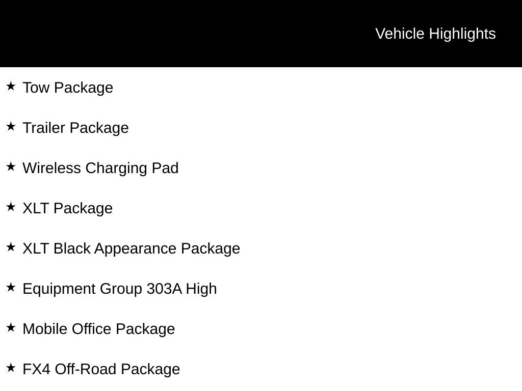 2025 Oxford White 2025 Ford F-150 XLT 4WD 3.5L PowerBoost Full-Hybrid V6 12" LCD Productivity Touchscreen, 5G WiFi Hotspot Telematics, Auto LED Headlights, Backup Camera, Blind Spot Monitoring, BLIS w/ Cross Traffic Alert, Bluetooth w/ Audio Streaming, Lane Keeping System, Off Road Package, Parking Sensors, Post Collision Braking, Power Sliding Rear Window, Pre Collision Assist w/ AEB, Reverse Brake Assist, Reverse Sensing, Skid Plate Package, Tow Package, Trailer Package, Wireless Charging Pad, XLT Package, 4D SuperCrew, 3.5L PowerBoost Full-Hybrid V6, 10-Speed Automatic, 4WD, 360 Degree Camera, 4 Pickup Box Tie-Down Plates, 400W Cab & Bed Outlets, 4x4 FX4 Off-Road Bodyside Decal, 6" Angular Bright Anodized Step Bar, 6" Black Running Boards, Adaptive Cruise Control w/Stop & Go, Auto-Dimming Rear-View Mirror, Bed Utility Package, Black Exterior Badging, Black Grille, Black Painted Grille w/Chrome Center Bar, Body-Color Front & Rear Bumpers, Chrome Door & Tailgate Handles, Chrome Single-Tip Exhaust, Cloth 40/Console/40 Front Seats, Connected Navigation, Console Worksurface, Dark Interior Appliques, Driver State Detection, Dual-Zone Electronic Automatic Temperature Control, Equipment Group 303A High, Evasive Steering Assist, Floor Shifter, Ford Co-Pilot360 Assist 2.0, Front Parking Sensors, FX4 Off-Road Package, Gray Box Side Decal, Heated Front Seats, Hill Descent Control, Intelligent Access w/Push Button Start, LED Box Lighting, Mobile Office Package, Monotube Rear Shocks, Off-Road Tuned Front Shock Absorbers, Partitioned Lockable Rear Storage, Power Glass Heated Sideview Mirrors, Power-Adjustable Pedals, Power-Sliding Rear Window, Radio: B&O Sound System by Bang & Olufsen, Remote Start System w/Remote Tailgate Release, Rock Crawl Mode, Tailgate Step w/Tailgate Work Surface, Towing Technology, Tray Style Floor Liner w/o Carpet Mats, Unique Sport Cloth 40/Console/40 Front-Seats, Wheels: 18" Gloss Black, Wheels: 20" Chrome-Like PVD, Wrapped Steering Wheel, XLT Black Appearance Package. Bed Utility Package (4 Pickup Box Tie-Down Plates, LED Box Lighting, and Tailgate Step w/Tailgate Work Surface), Equipment Group 303A High (360 Degree Camera, 400W Cab & Bed Outlets, 6" Angular Bright Anodized Step Bar, Adaptive Cruise Control w/Stop & Go, Auto-Dimming Rear-View Mirror, Black Painted Grille w/Chrome Center Bar, Chrome Door & Tailgate Handles, Chrome Single-Tip Exhaust, Connected Navigation, Driver State Detection, Dual-Zone Electronic Automatic Temperature Control, Evasive Steering Assist, Ford Co-Pilot360 Assist 2.0, Front Parking Sensors, Heated Front Seats, Intelligent Access w/Push Button Start, Power Glass Heated Sideview Mirrors, Power-Adjustable Pedals, Power-Sliding Rear Window, Radio: B&O Sound System by Bang & Olufsen, Remote Start System w/Remote Tailgate Release, Towing Technology, Wheels: 20" Chrome-Like PVD, and Wrapped Steering Wheel), FX4 Off-Road Package (4x4 FX4 Off-Road Bodyside Decal, Hill Descent Control, Monotube Rear Shocks, Off-Road Tuned Front Shock Absorbers, Rock Crawl Mode, and Tray Style Floor Liner w/o Carpet Mats), Mobile Office Package (Console Worksurface and Partitioned Lockable Rear Storage), XLT Black Appearance Package (6" Black Running Boards, Black Exterior Badging, Black Grille, Body-Color Front & Rear Bumpers, Dark Interior Appliques, Floor Shifter, Gray Box Side Decal, Unique Sport Cloth 40/Console/40 Front-Seats, and Wheels: 18" Gloss Black), 4D SuperCrew, 3.5L PowerBoost Full-Hybrid V6, 10-Speed Automatic, 4WD, Cloth 40/Console/40 Front Seats, 4-Wheel Disc Brakes, 6 Speakers, ABS brakes, Air Conditioning, Alloy wheels, Auto High-beam Headlights, Brake assist, Bumpers: chrome, Chrome wheels, Cloth 40/20/40 Front Seat, Compass, Delay-off headlights, Driver door bin, Driver vanity mirror, Dual front impact airbags, Dual front side impact airbags, Electronic Stability Co Price includes dealer added acce