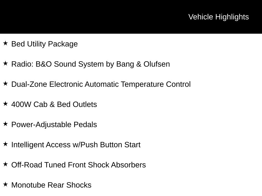 2025 Agate Black Metallic 2025 Ford F-150 XLT 4WD 3.5L PowerBoost Full-Hybrid V6 12" LCD Productivity Touchscreen, 5G WiFi Hotspot Telematics, Auto Emergency Braking, Auto LED Headlights, Backup Camera, Blind Spot Monitoring, BLIS w/ Cross Traffic Alert, Bluetooth w/ Audio Streaming, Lane Keeping System, Off Road Package, Parking Sensors, Power Sliding Rear Window, Premium Sound Package, Reverse Brake Assist, Reverse Sensing, Skid Plate Package, Tow Package, Trailer Package, Wireless Charging Pad, XLT Package, 4D SuperCrew, 3.5L PowerBoost Full-Hybrid V6, 10-Speed Automatic, 4WD, 360 Degree Camera, 4 Pickup Box Tie-Down Plates, 400W Cab & Bed Outlets, 4x4 FX4 Off-Road Bodyside Decal, 6" Angular Bright Anodized Step Bar, 6" Black Running Boards, Adaptive Cruise Control w/Stop & Go, Auto-Dimming Rear-View Mirror, Bed Utility Package, Black Exterior Badging, Black Grille, Black Painted Grille w/Chrome Center Bar, Body-Color Front & Rear Bumpers, Chrome Door & Tailgate Handles, Chrome Single-Tip Exhaust, Cloth 40/Console/40 Front Seats, Connected Navigation, Console Worksurface, Dark Interior Appliques, Driver State Detection, Dual-Zone Electronic Automatic Temperature Control, Electronic Locking w/3.73 Axle Ratio, Equipment Group 303A High, Evasive Steering Assist, Floor Shifter, Ford Co-Pilot360 Assist 2.0, Front Parking Sensors, FX4 Off-Road Package, Gray Box Side Decal, Heated Front Seats, Hill Descent Control, Intelligent Access w/Push Button Start, LED Box Lighting, Mobile Office Package, Monotube Rear Shocks, Off-Road Tuned Front Shock Absorbers, Partitioned Lockable Rear Storage, Power Glass Heated Sideview Mirrors, Power-Adjustable Pedals, Power-Sliding Rear Window, Radio: B&O Sound System by Bang & Olufsen, Remote Start System w/Remote Tailgate Release, Rock Crawl Mode, Tailgate Step w/Tailgate Work Surface, Towing Technology, Tray Style Floor Liner w/o Carpet Mats, Unique Sport Cloth 40/Console/40 Front-Seats, Wheels: 18" Gloss Black, Wheels: 20" Chrome-Like PVD, Wrapped Steering Wheel, XLT Black Appearance Package. Bed Utility Package (4 Pickup Box Tie-Down Plates, LED Box Lighting, and Tailgate Step w/Tailgate Work Surface), Equipment Group 303A High (360 Degree Camera, 400W Cab & Bed Outlets, 6" Angular Bright Anodized Step Bar, Adaptive Cruise Control w/Stop & Go, Auto-Dimming Rear-View Mirror, Black Painted Grille w/Chrome Center Bar, Chrome Door & Tailgate Handles, Chrome Single-Tip Exhaust, Connected Navigation, Driver State Detection, Dual-Zone Electronic Automatic Temperature Control, Evasive Steering Assist, Ford Co-Pilot360 Assist 2.0, Front Parking Sensors, Heated Front Seats, Intelligent Access w/Push Button Start, Power Glass Heated Sideview Mirrors, Power-Adjustable Pedals, Power-Sliding Rear Window, Radio: B&O Sound System by Bang & Olufsen, Remote Start System w/Remote Tailgate Release, Towing Technology, Wheels: 20" Chrome-Like PVD, and Wrapped Steering Wheel), FX4 Off-Road Package (4x4 FX4 Off-Road Bodyside Decal, Hill Descent Control, Monotube Rear Shocks, Off-Road Tuned Front Shock Absorbers, Rock Crawl Mode, and Tray Style Floor Liner w/o Carpet Mats), Mobile Office Package (Console Worksurface and Partitioned Lockable Rear Storage), XLT Black Appearance Package (6" Black Running Boards, Black Exterior Badging, Black Grille, Body-Color Front & Rear Bumpers, Dark Interior Appliques, Floor Shifter, Gray Box Side Decal, Unique Sport Cloth 40/Console/40 Front-Seats, and Wheels: 18" Gloss Black), 4D SuperCrew, 3.5L PowerBoost Full-Hybrid V6, 10-Speed Automatic, 4WD, Cloth 40/Console/40 Front Seats, Electronic Locking w/3.73 Axle Ratio, 4-Wheel Disc Brakes, 6 Speakers, ABS brakes, Air Conditioning, Alloy wheels, Auto High-beam Headlights, Brake assist, Bumpers: chrome, Chrome wheels, Cloth 40/20/40 Front Seat, Compass, Delay-off headlights, Driver door bin, Driver vanity mirror, Dual Price includes dealer added acce