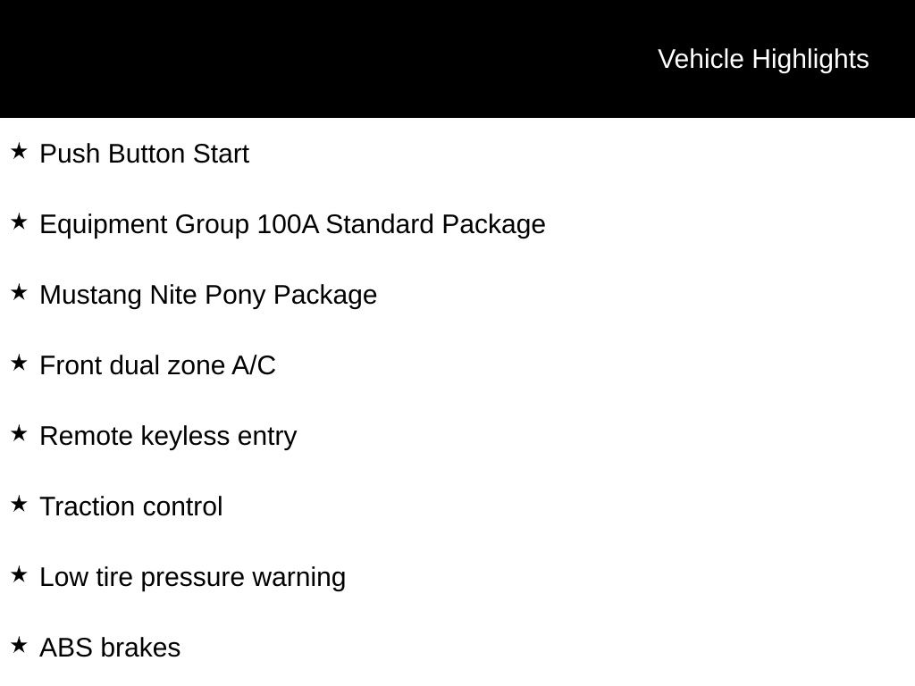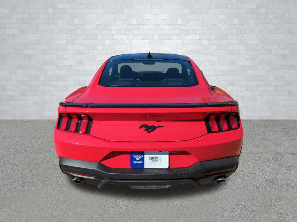 2026 Shadow Black 2026 Ford Mustang EcoBoost RWD EcoBoost 2.3L I4 GTDi DOHC Turbocharged VCT 12.3" HD Color Driver Cluster, 13.2" LCD Centerstack Touchscreen, 4G WiFi Hotspot Telematics, Auto LED Headlights, Backup Camera, Bluetooth w/ Audio Streaming, Power Mirror Package, Power Package, Push Button Start, 2D Coupe, EcoBoost 2.3L I4 GTDi DOHC Turbocharged VCT, 10-Speed Automatic, RWD, ABS brakes, Alloy wheels, Black Mirror Caps, Black Painted Wedge Decklid Spoiler, Compass, Electronic Stability Control, Equipment Group 100A Standard Package, Front dual zone A/C, Illuminated entry, Low tire pressure warning, Mustang Nite Pony Package, Painted Black Roof, Rain sensing wipers, Remote keyless entry, Speed-Sensitive Wipers, Traction control, Wheels: 19" x 8.5" Ebony Black-Painted Aluminum. Equipment Group 100A Standard Package (AM/FM Stereo, Cloth Bucket Seats, and SYNC 4), Mustang Nite Pony Package (Black Mirror Caps, Black Painted Wedge Decklid Spoiler, Painted Black Roof, and Wheels: 19" x 8.5" Ebony Black-Painted Aluminum), 2D Coupe, EcoBoost 2.3L I4 GTDi DOHC Turbocharged VCT, 10-Speed Automatic, RWD, ABS brakes, Alloy wheels, Compass, Electronic Stability Control, Front dual zone A/C, Illuminated entry, Low tire pressure warning, Rain sensing wipers, Remote keyless entry, Speed-Sensitive Wipers, Traction control, 4-Wheel Disc Brakes, 6 Speakers, Air Conditioning, AM/FM radio, Auto High-beam Headlights, Automatic temperature control, Brake assist, Bumpers: body-color, Delay-off headlights, Driver door bin, Driver vanity mirror, Dual front impact airbags, Dual front side impact airbags, Emergency communication system: 911 Assist, Exterior Parking Camera Rear, Four wheel independent suspension, Front anti-roll bar, Front Bucket Seats, Front Center Armrest, Front reading lights, Fully automatic headlights, Knee airbag, Leather Shift Knob, Occupant sensing airbag, Outside temperature display, Overhead airbag, Overhead console, Panic alarm, Passenger door bin, Passenger vanity mirror, Power door mirrors, Power steering, Power windows, Radio data system, Rear anti-roll bar, Rear Parking Sensors, Rear window defroster, Speed control, Speed-sensing steering, Split folding rear seat, Sport steering wheel, Steering wheel mounted audio controls, Tachometer, Telescoping steering wheel, Tilt steering wheel, Trip computer, Variably intermittent wipers, and Voltmeter Courtesy Ford and Lincoln of Rome 101 Hwy 411 E Rome, Ga 30161 ROMEFORDLINC.COM 706.235.4453.