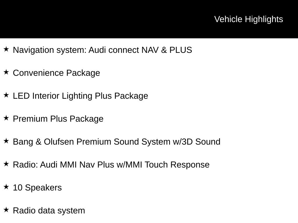 - Radio: Audi MMI Nav Plus w/MMI Touch Response