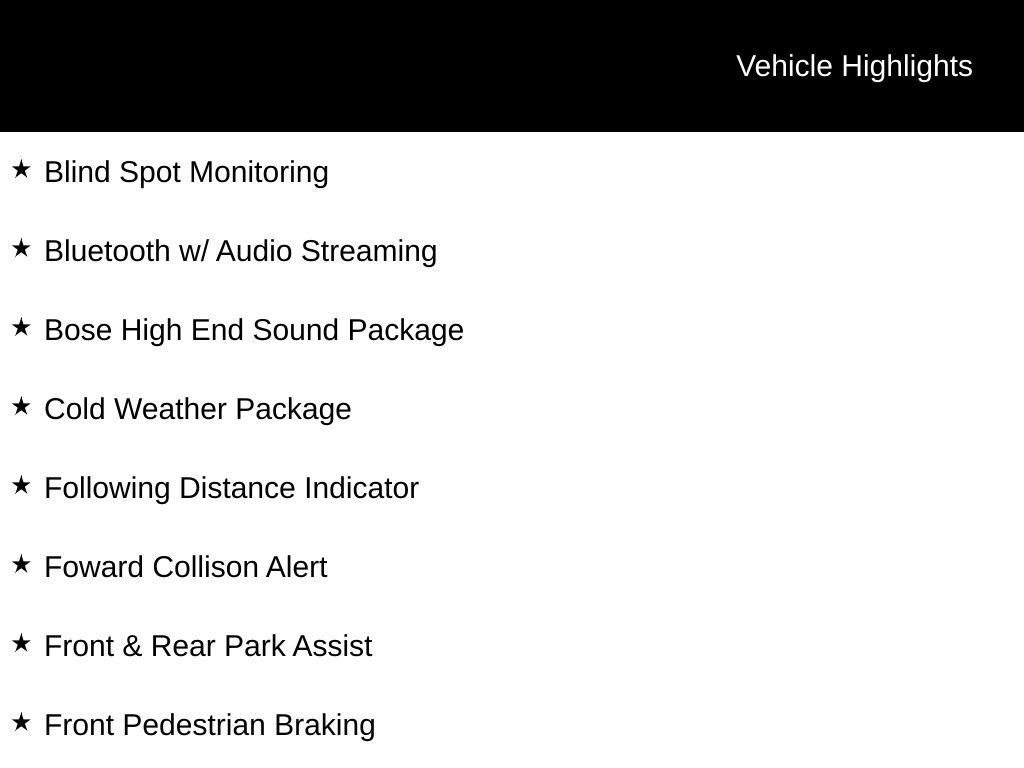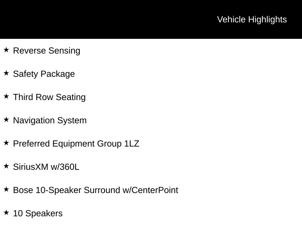- 3rd Row Seating, Adaptive Ride Package, Adaptive Suspension, Android Auto, Apple Carplay, Auto Emergency Braking, Auto LED Headlights, Backup Camera, Blind Spot Monitoring, Bluetooth w/ Audio Streaming, Bose High End Sound Package, Cold Weather Package, Following Distance Indicator, Foward Collison Alert, Front & Rear Park Assist, Front Pedestrian Braking, Lane Departure Warning, Lane Keeping System, Leather Seats, Mechanical Limited Slip Differential, Memory Package, Multi Zone Climate Control, Multimedia Package, Parking Sensors, Power Mirror Package, Power Package, Preferred Equipment Package, Premium Audio Package, Premium Sound Package, Rear Climate Package, Rear Cross Traffic Alert, Reverse Brake Assist, Reverse Sensing, Safety Package, Third Row Seating